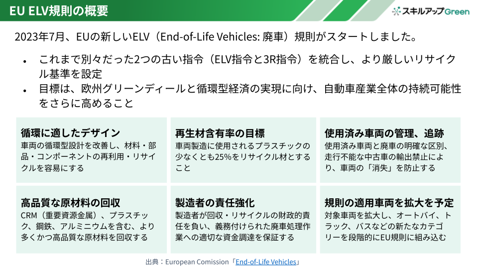 「EU ELV規則」は、再生材利用や有害物質削減、トレーサビリティ強化などを求めています。2025年7月には修正案が公表され、再生プラスチックの含有要件や対象車種の拡大などの追加要件が議論されています。