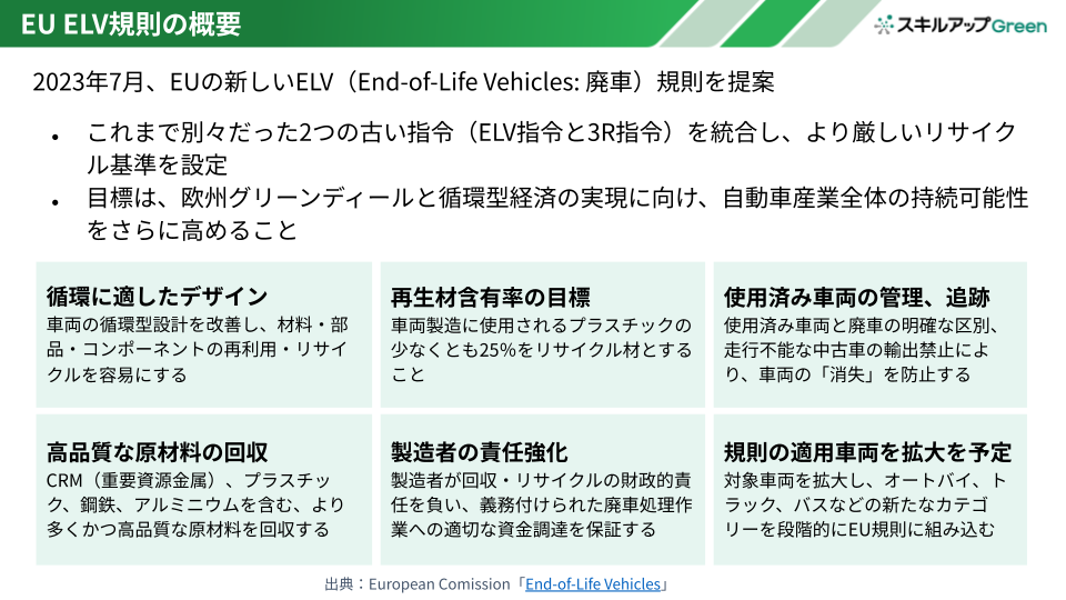 「EU ELV規則」は、再生材利用や有害物質削減、トレーサビリティ強化などを求めています。2025年7月には修正案が公表され、さらに9月の規則案の正式採択により、最終決定がなされる見込みです。