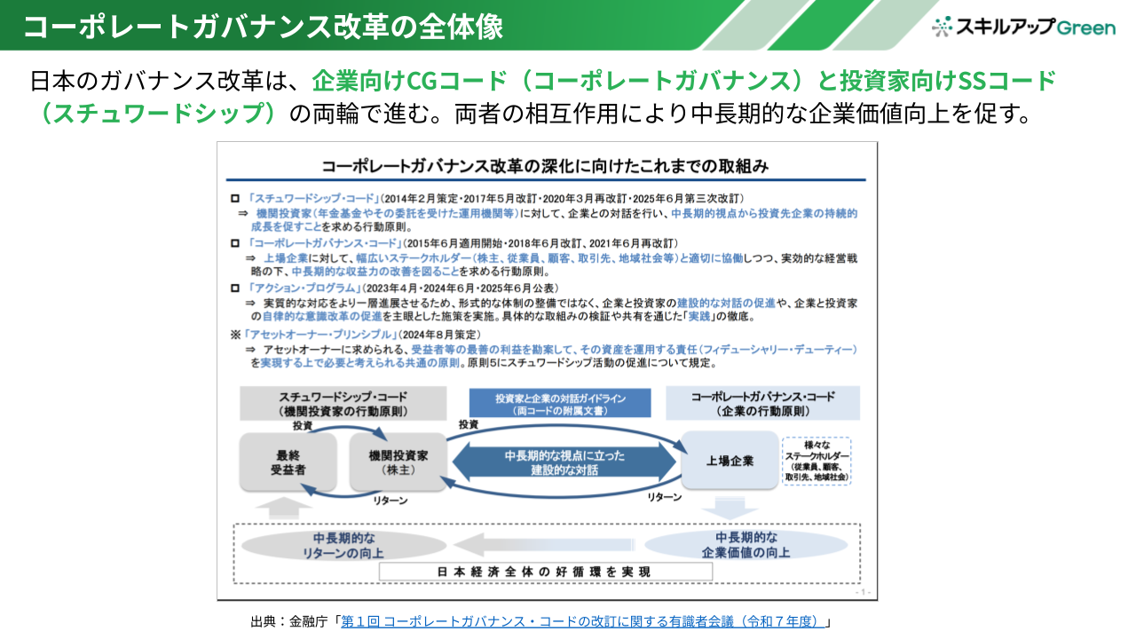 本資料では、なぜ今ガバナンス改革が重要なのか、両コードはどのような行動原則を定めているのか、そして企業と投資家がどう実践すべきかを体系的に解説します。