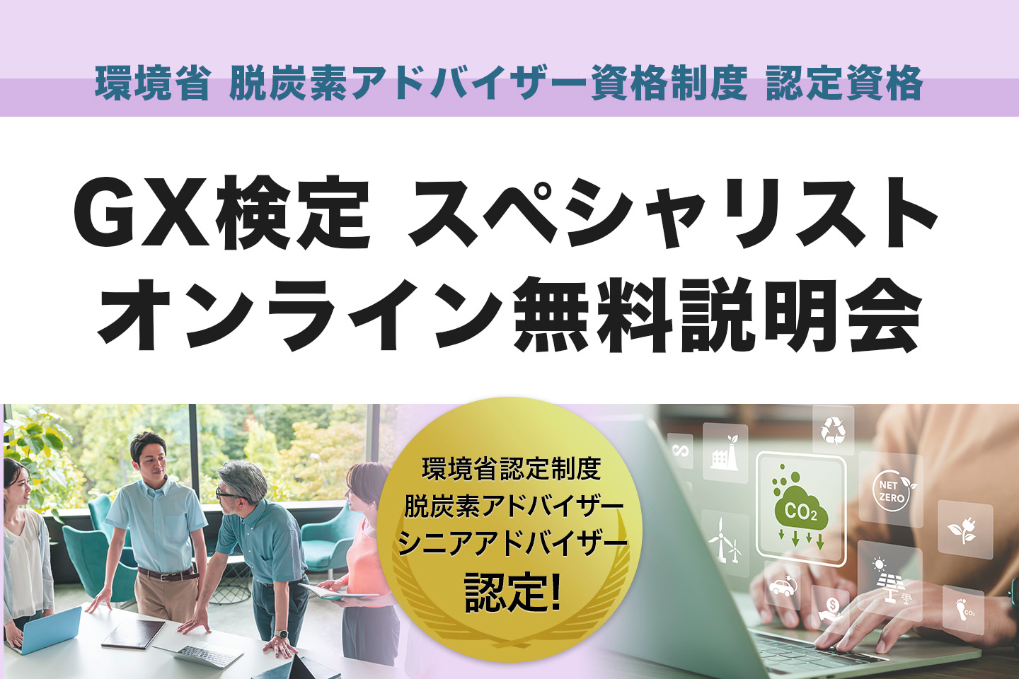 - 本説明会では、脱炭素アドバイザー資格の一つで、上級レベルにあたる「GX検定 スペシャリスト」の概要や特長、対策のコツ、対応講座について説明します。また、中級レベルの「GX検定アドバンスト」との違いなどもお話しします。