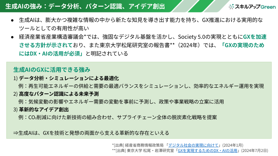 まず、「AI=電力消費増=環境負荷の要因」というイメージを一度脇に置き、AIがGXにもたらすメリットに目を向けましょう。ホワイトペーパーでは、生成AIの強みである「データ分析」「シミュレーション」「パターン認識」が、GXの現場に変革をもたらすと解説されています。