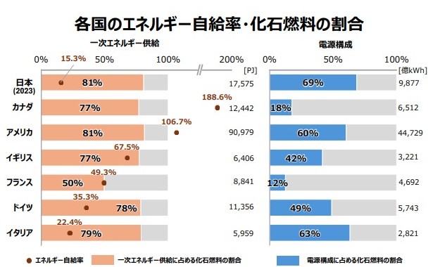 経済産業省によると2023年度の日本のエネルギー自給率は15.3%)で、G7の各国中(アメリカ、イギリス、フランス、ドイツ、イタリア、カナダ、EU)で一番低い水準でした。また発電エネルギーの7割程度を化石燃料に依存しています。