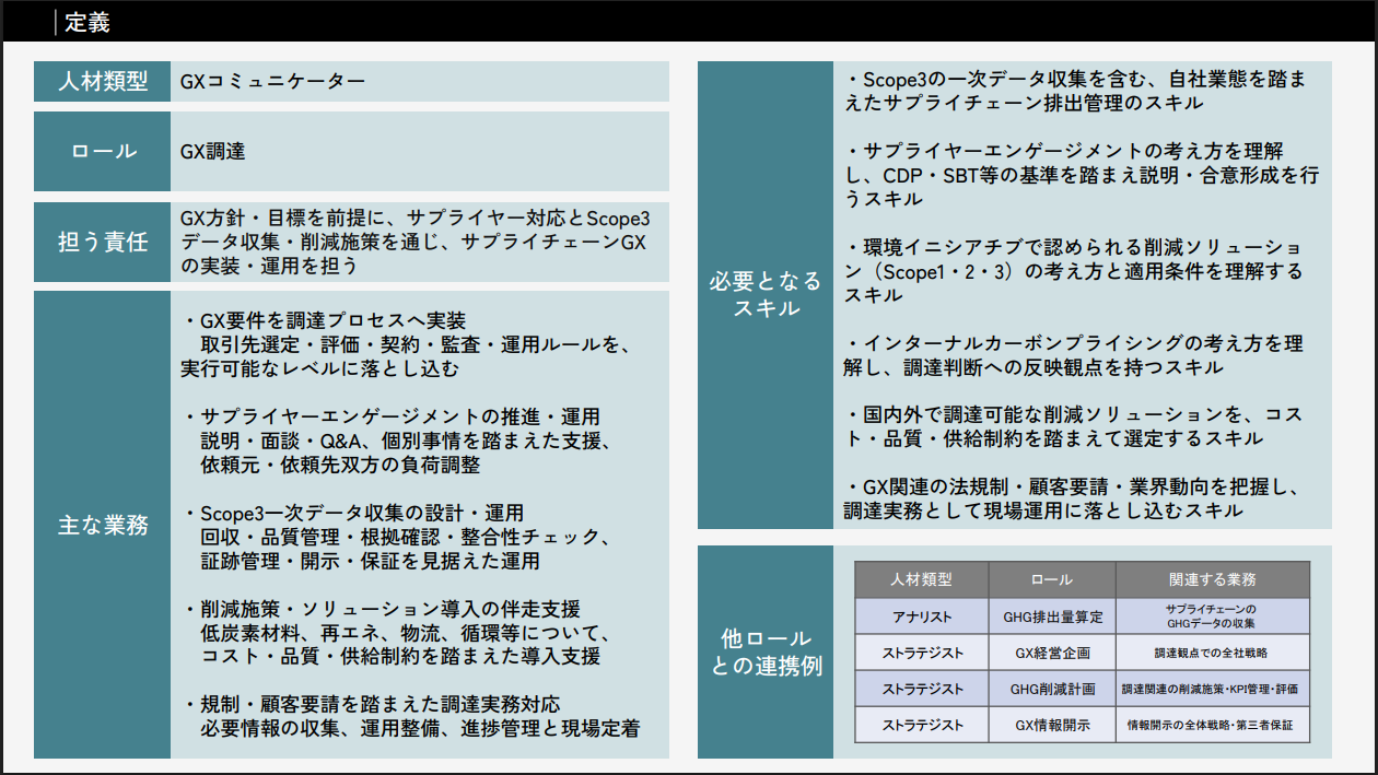 実務の実態に合わせ、「GXコミュニケーター」という人材類型に含まれる「GX調達」ロールの定義が大幅に改定されました。Ver2.0までは「サプライチェーン全体の削減戦略立案」という企画的な側面が強調されていましたが、ワーキンググループでの議論の結果、全社戦略の立案は「GX経営企画」や「GHG削減計画」の役割であり、「GX調達」は「サプライチェーンへの削減計画の推進実行や、サプライヤーへの伴走支援(Scope3の一次データ収集など)」を実務として担うケースが多いことが判明しました。この実態を反映し、より現場の動きに即した役割定義へと見直されました。