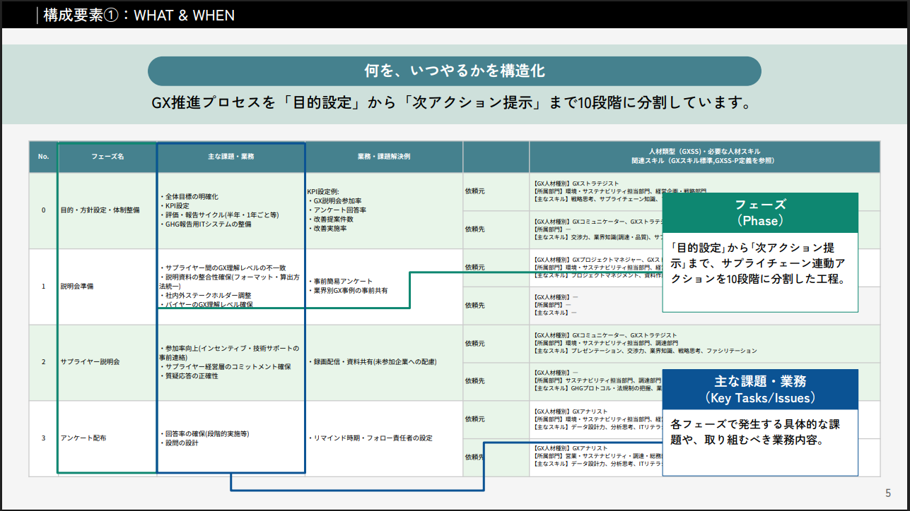 - GX推進スキル標準(GXSS-P)Ver2.1:「GX調達」ロールの定義が大きく改定され、サプライチェーン全体への削減計画の「推進実行・伴走支援」を担う、より現場に即した実践的な役割へと見直されました。